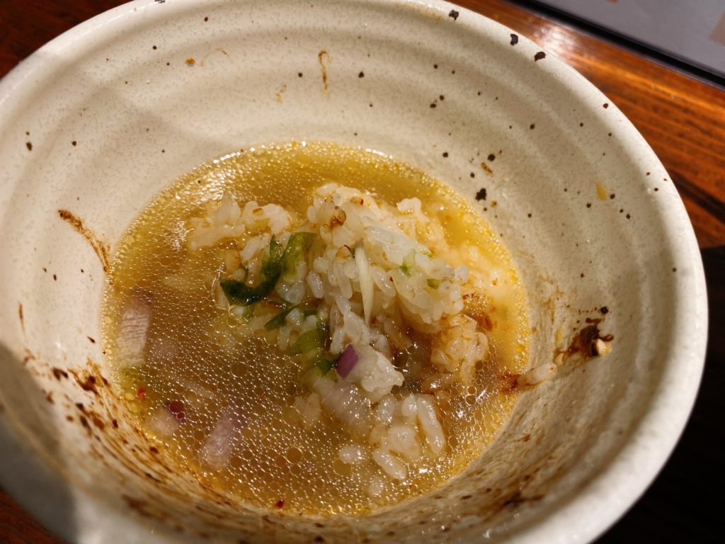 そしてラーメンを食べる合間に、少しずつ上部を食べていたよだれ鶏めしの、下部のごはんのみを残したものにラーメンのスープを入れてみました。