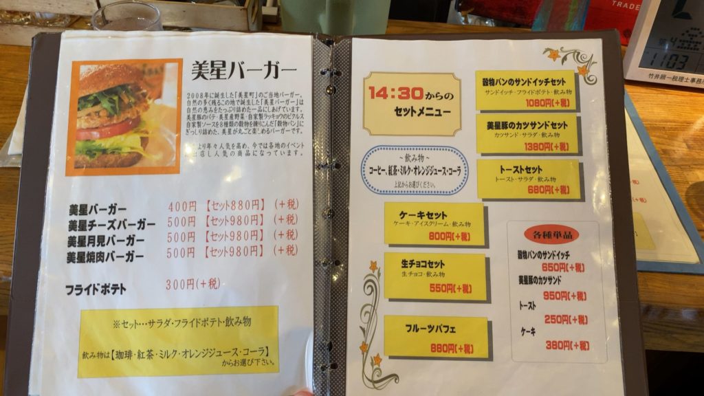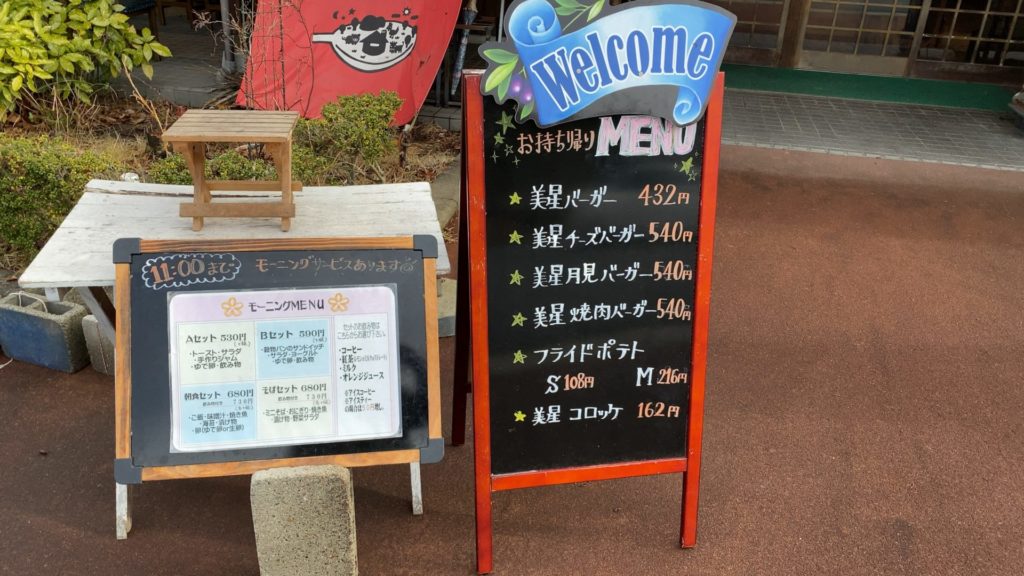 テイクアウトの美星バーガーと美星コロッケを持って車に乗り込みました。