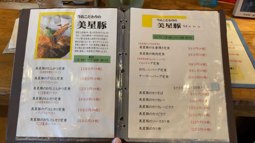 私は、今日は美星豚を食べる!と決めていたので、「美星豚の洋風角煮とそばのランチ」と「美星豚のおろしとんかつ定食」「美星豚のとんかつ定食」の三つ巴戦が頭の中で繰り広げられましたが、軍配は「美星豚のとんかつ定食」<自家製味噌カツソース>に決まりました。