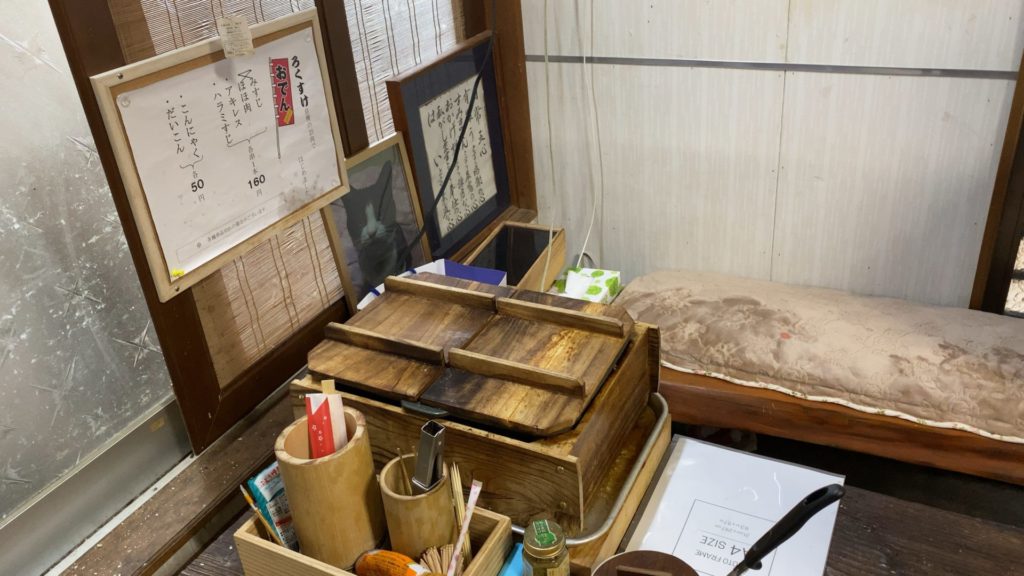 おでんを煮ている入れ物のあるテーブルと長椅子。