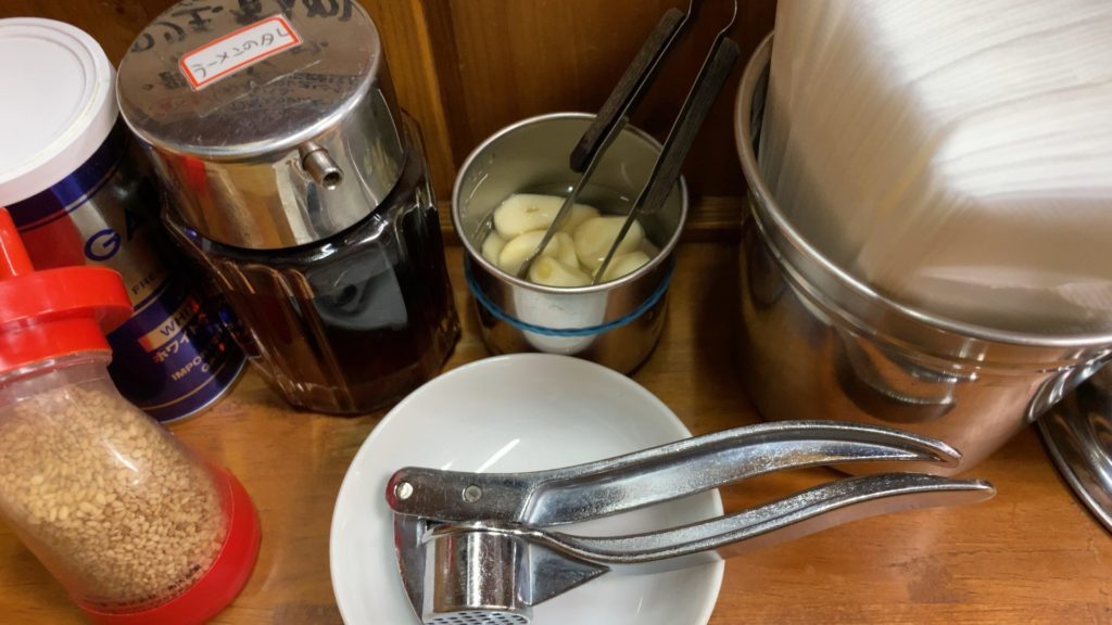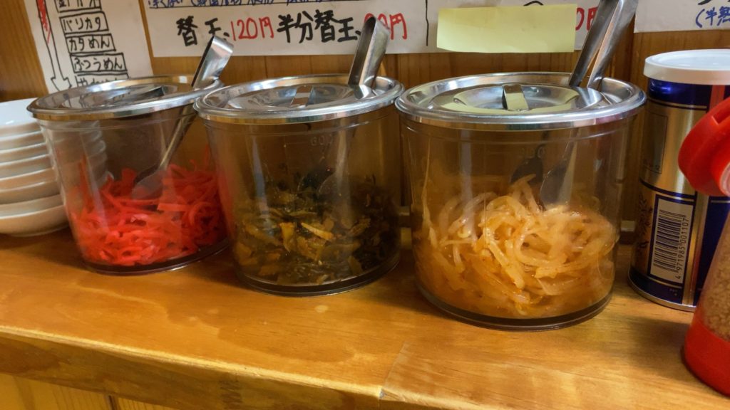 カウンターには、紅生姜、野沢菜、もやしのナムルが備え付けられています。