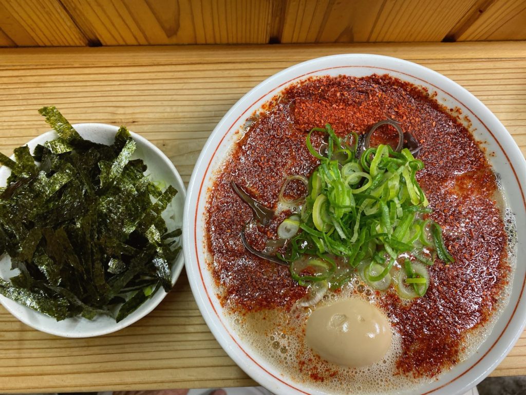 どっちにしても仕事中の私としては、ニンニクNGなので(大好きなのに)、赤いとんこつラーメン(750円)と、味玉(100円)と替えめし(150円)を麺硬めでオーダーして、ジャスト1000円(税込)となりました。