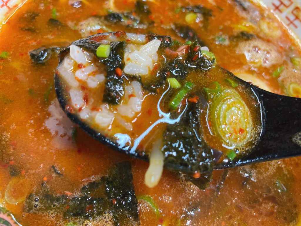本当はスープをご飯にかけて食べるものですが、食器を汚したく無いことも含めて今回は、ご飯をラーメンの中に入れて頂きました。
