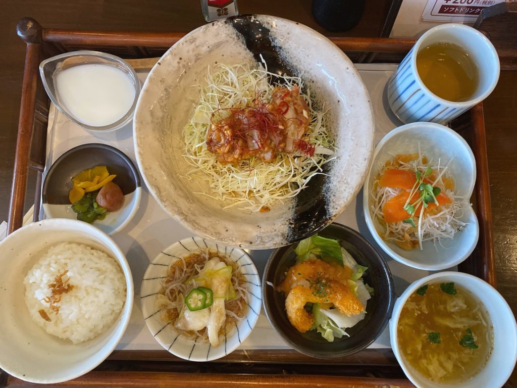 シンプル(Simple)の日替わりランチの中華は和風で薄味 素材の味をしっかり楽しめて、油淋鶏もサラダ風刺し身もスープも美味しい