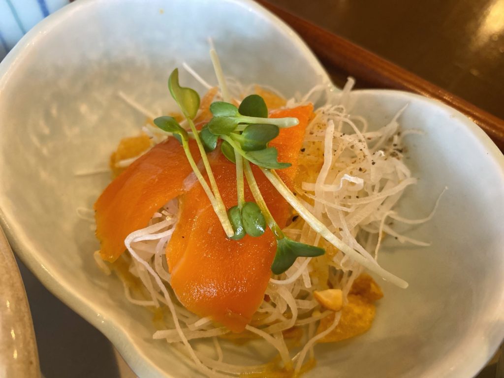 サラダ風お刺身となるこちらのサーモンと大根サラダも、ドレッシングにナッツ等が含まれて、とても複雑で深い味になっていました。