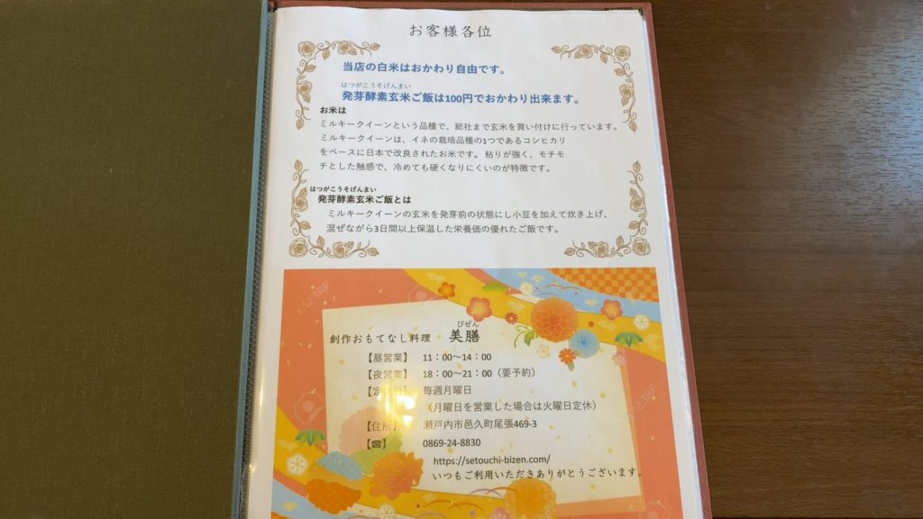 邑久駅からも歩いて10分ほどで、瀬戸内市中央公民館の南側にある、創作おもてなし料理 美膳という和食のお店。