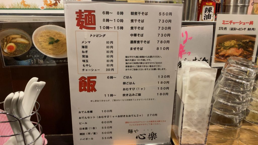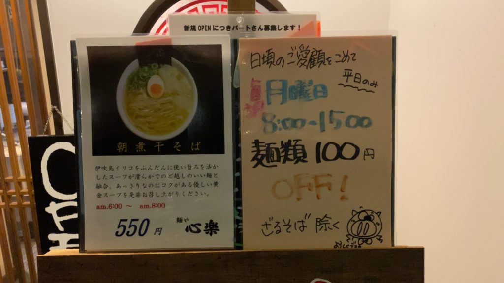 麺や 心楽(こらく)の朝6時のメニューは、朝煮干そばのみで550円!細麺と平打ち麺の選択が出来るのも嬉しい