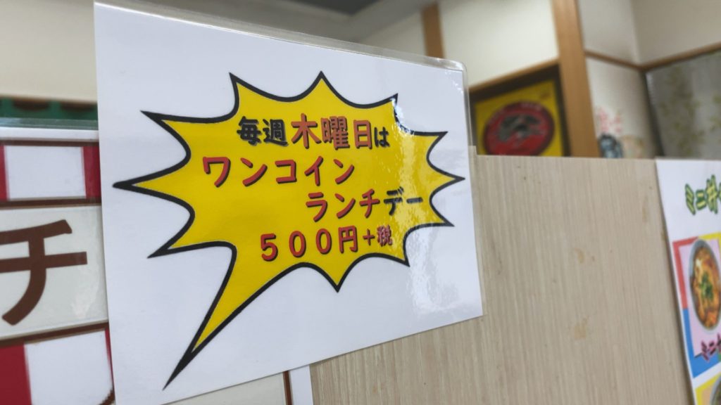 ランチを味玉追加でオーダーしましたが、木曜日はワンコインの500円(こちらは税別)になるのは嬉しい!!