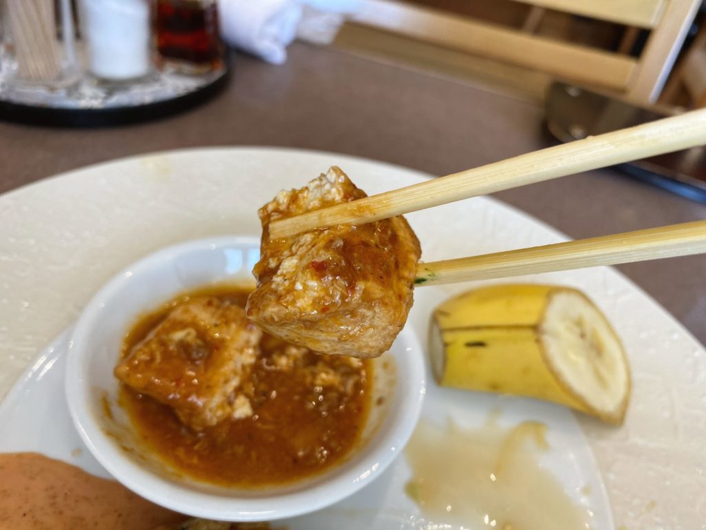 料理名は分かりませんが、揚げ豆腐のピリ辛味噌風味と名付けなくなる味の料理でした。