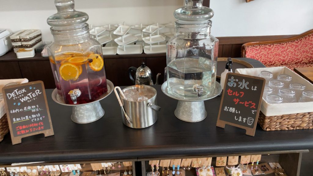 こちらの水はセルフとなっていますが、デトックスウォーターが何杯でも自由に飲めます。