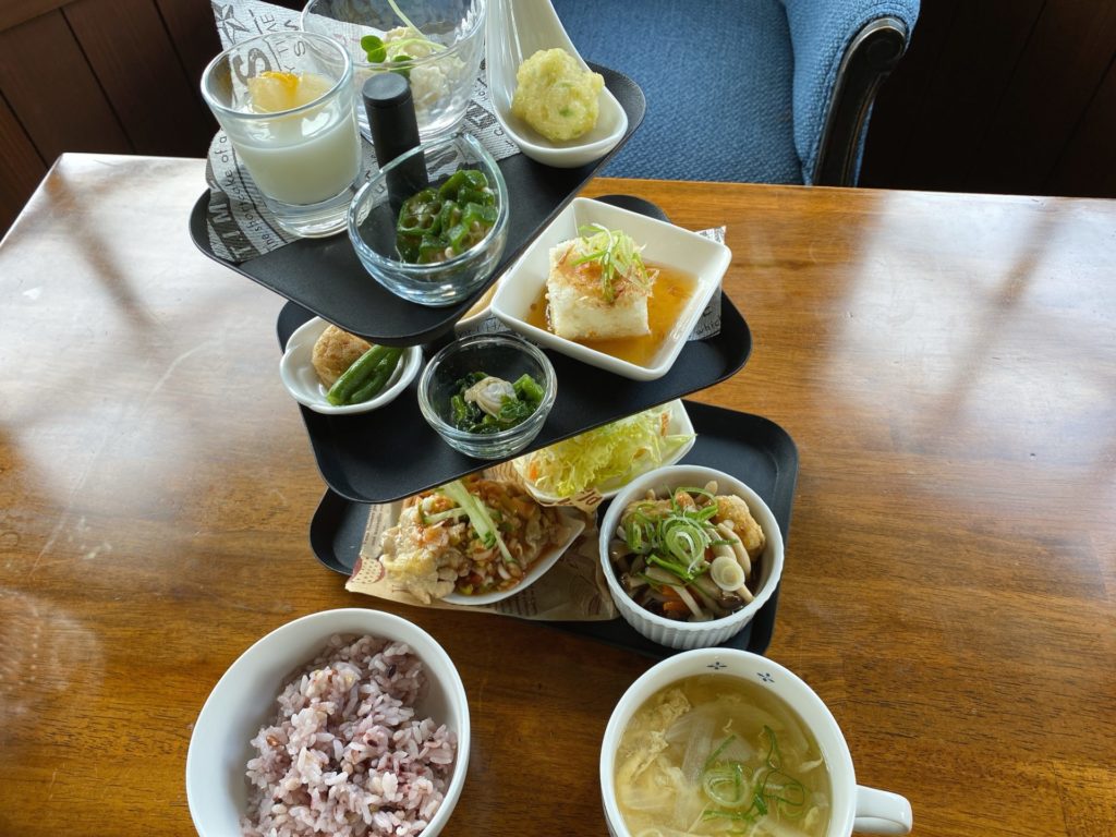 驚きの立体的プレートでの配膳が こびとカフェのスタイル!チキンソテーもまぐろの竜田揚げも超美味で、満足&満腹