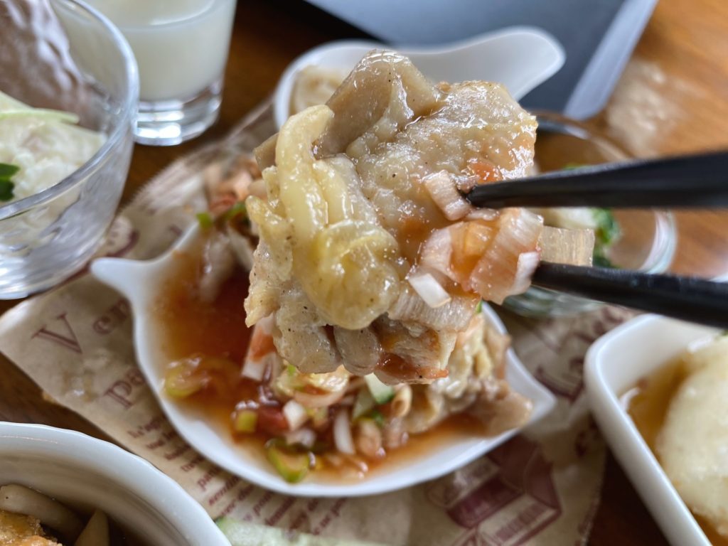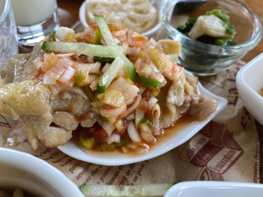 チキンが柔らかくて、梅肉ソースとネギ等の相性がバッチリで、とても美味しいです。