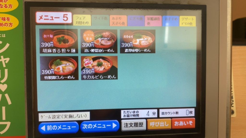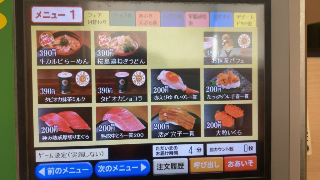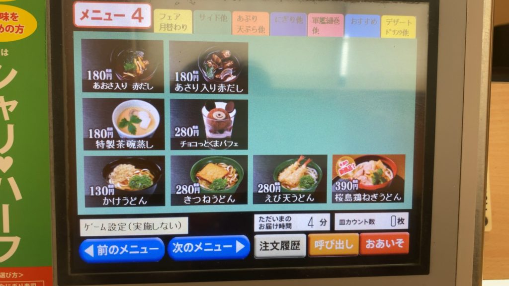 オーダーも無事に済んで、タッチパネルを見ると、上記写真のどれにも写っていますが「ただいまのお届け時間 4分」と表示されています。
