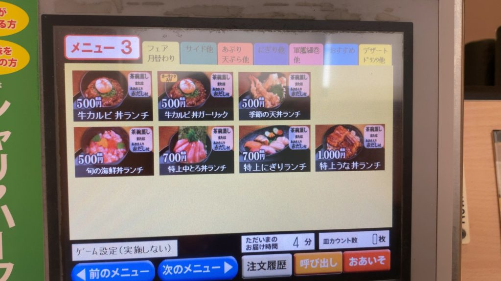 これはもしかして目の前にあるタッチパネルでの注文だよねと、ついでにメニューもチェック。