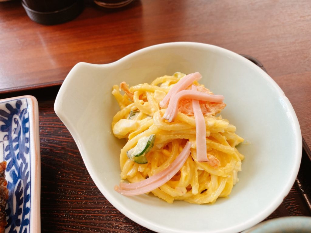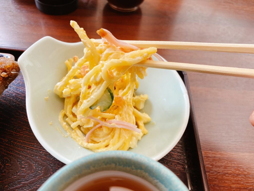 今日の日替わり定食は、スパゲティーサラダ付きの「あじの竜田揚げ」です。