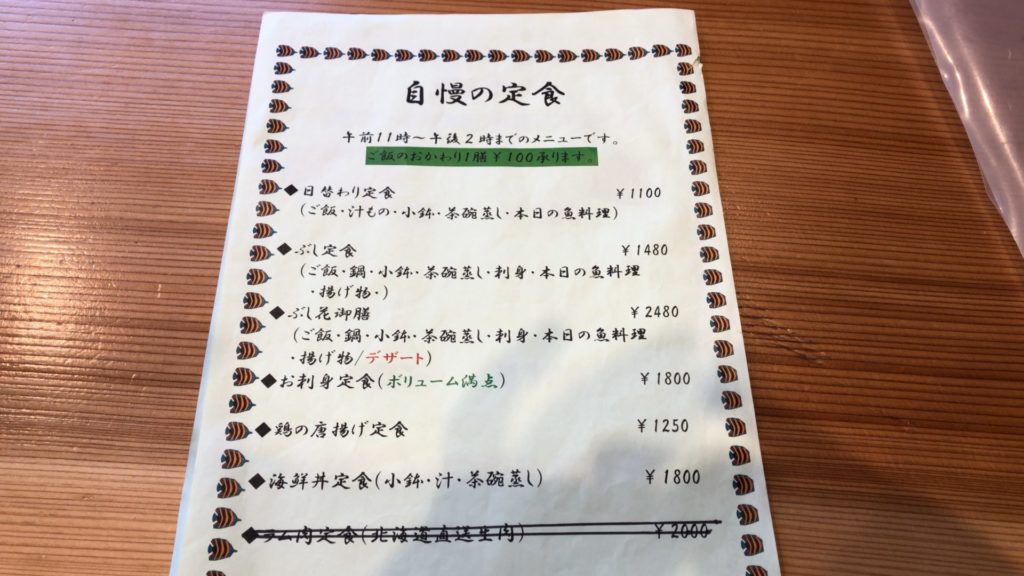 すると、店員さんが、「ぶし定食」にされますと、刺身と天ぷらが付きますよって。