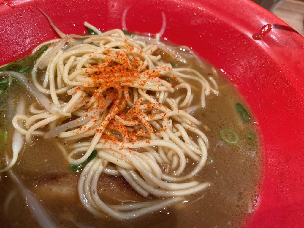 そして半分くらい食べたところで、味変に一味を投入してみました。