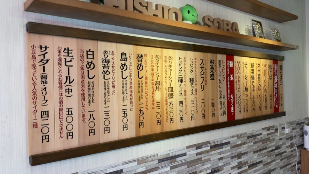 岡山駅前の小豆島ラーメン HISHIOのメニューで迷うも、「まずはコレ!」と書かれた醤(ひしお)そば+島めしセットをオーダー