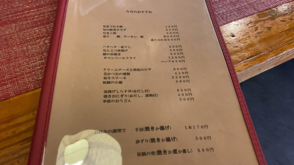 海鮮サラダ(700円)や、生ハムサラダ(600円)、旬の鮮魚造りもいいし、鮮魚のなめろうスタイル(650円)っていうのも気になります。