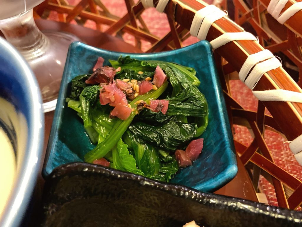 ほうれん草と紅生姜の煮びたしも、味とほうれん草の歯ごたえがしっかり残っていて、しっかり味わえた一品。