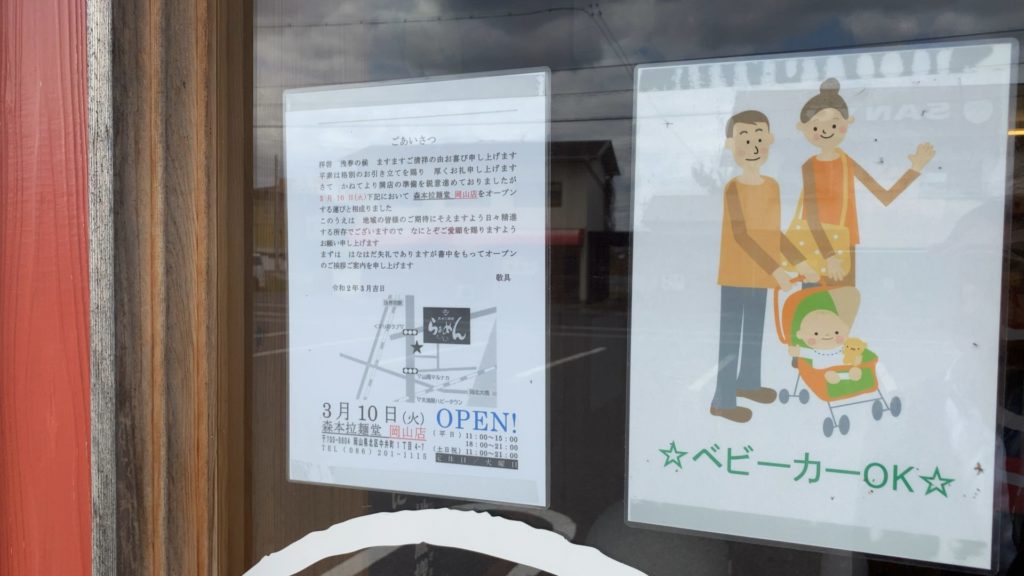 そしてその左には、森本拉麺堂 岡山店オープンのお知らせ!!