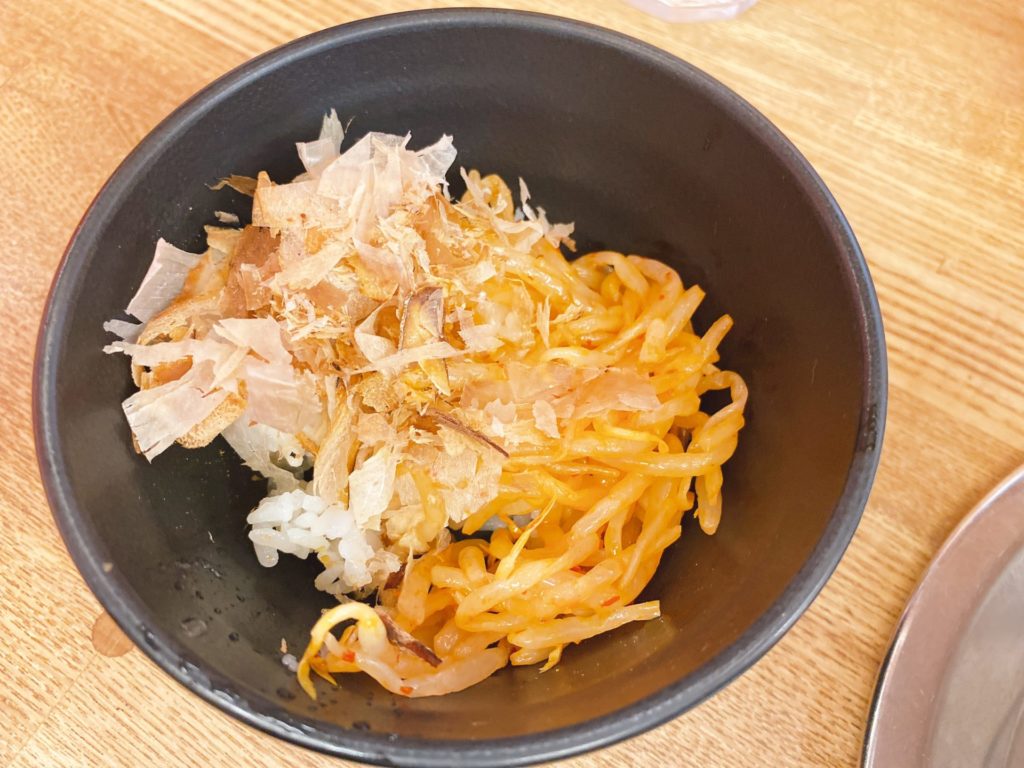 その前に、ご飯には卓上にあったカツオ節と辛もやしを乗せてみました。