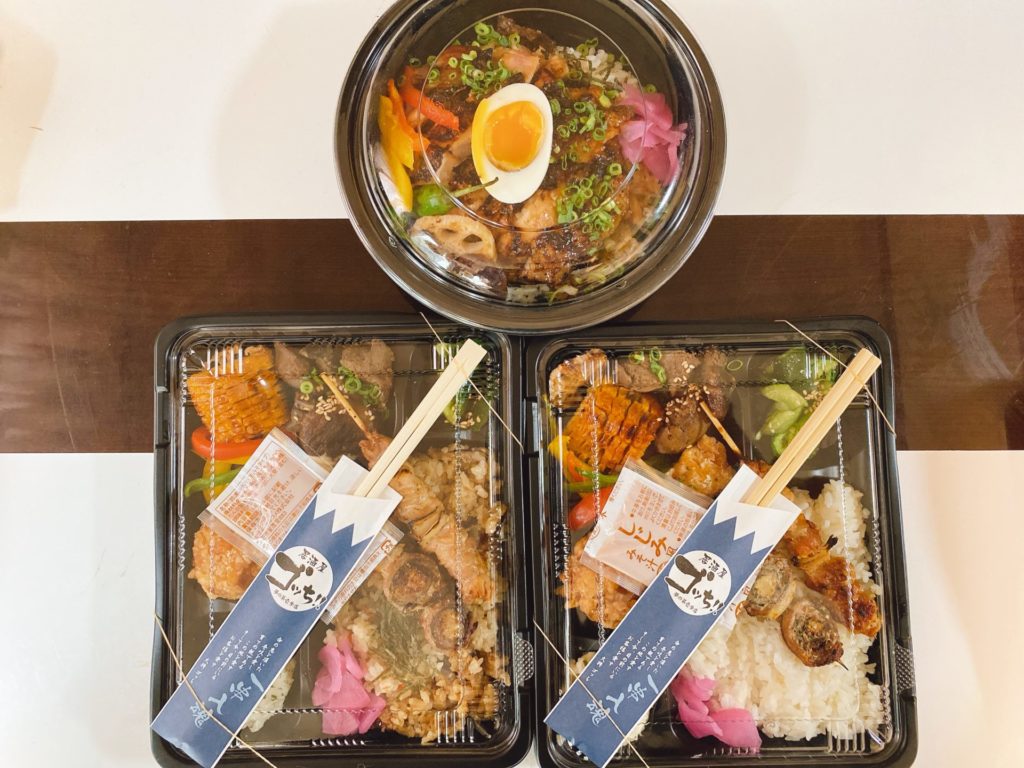 丸い容器に入ったのが「焼き鳥丼」、右下が「ゴッち風幕の内弁当」、左下が「ゴッち風幕の内弁当(かしわ飯)」です。
