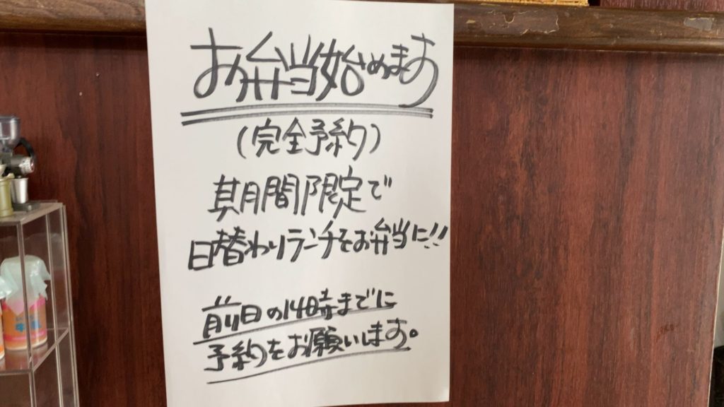コロナの影響で客数の減少は例外無く・・のようで、コロナが終息するまでの期間限定で、ランチ弁当のテイクアウトを始められたようです。