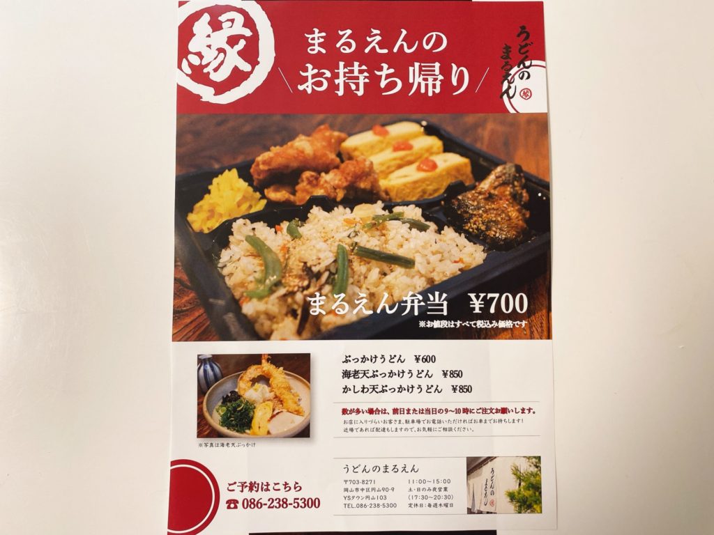 岡山市中区 うどんのまるえんのテイクアウトは、「まるえん弁当」だけじゃなく、ぶっかけうどんもある!