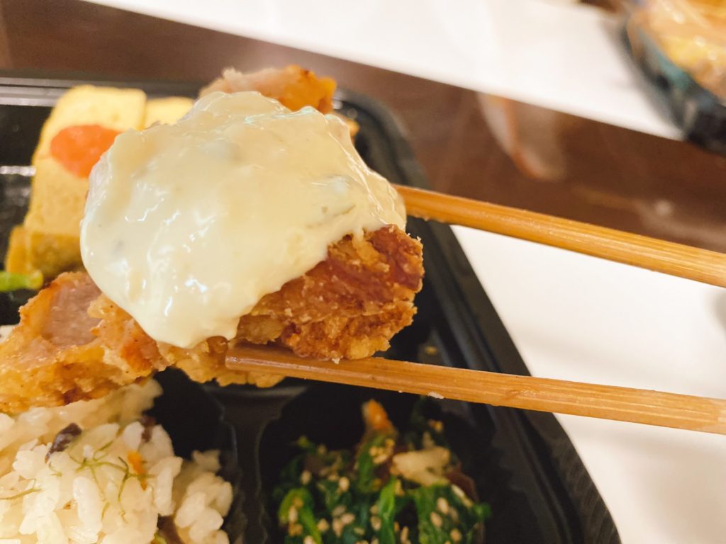 そして、その唐揚げをタルタルソースに付けて、大きな一口で。