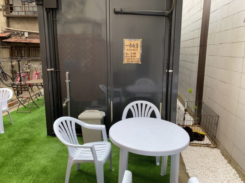 で、先ほどの入り口から階段を上がらずに、そのまま通り抜けて裏に出たところに「一歩弁当」があるようです。