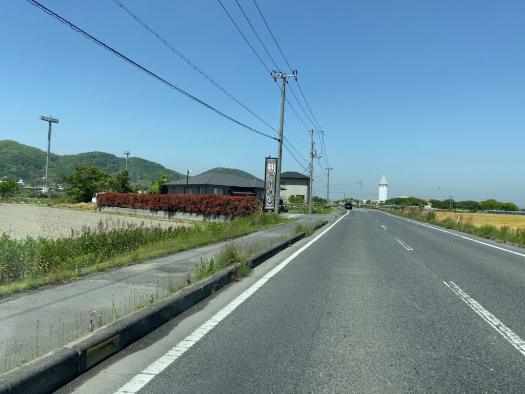 写真奥に見える白い塔が、サウスビレッジで、手前の「朝ラーメン」と縦の看板が出ているのがお店です。