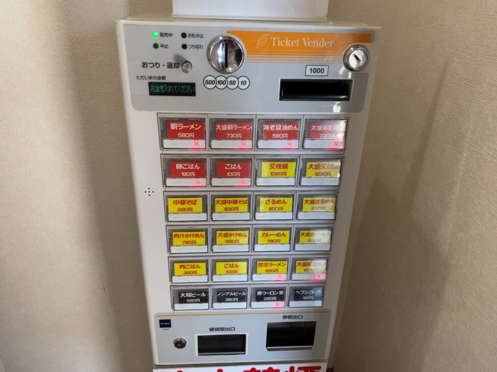 黄色いボタンが昼メニューですが、私が中華そばで、同僚は肉汁大盛りかけめんにしました。