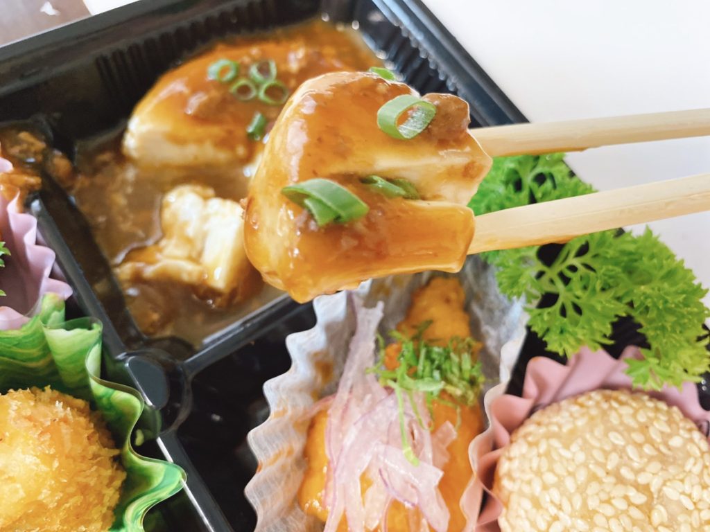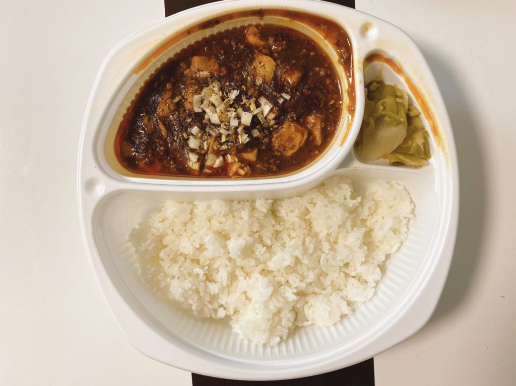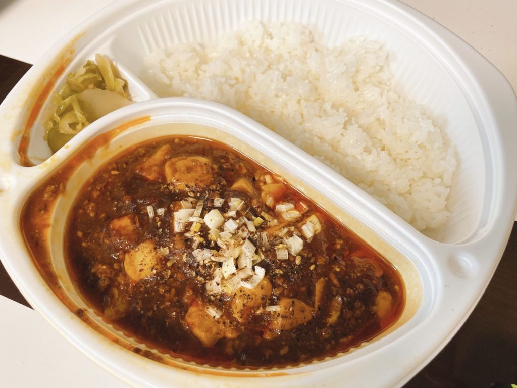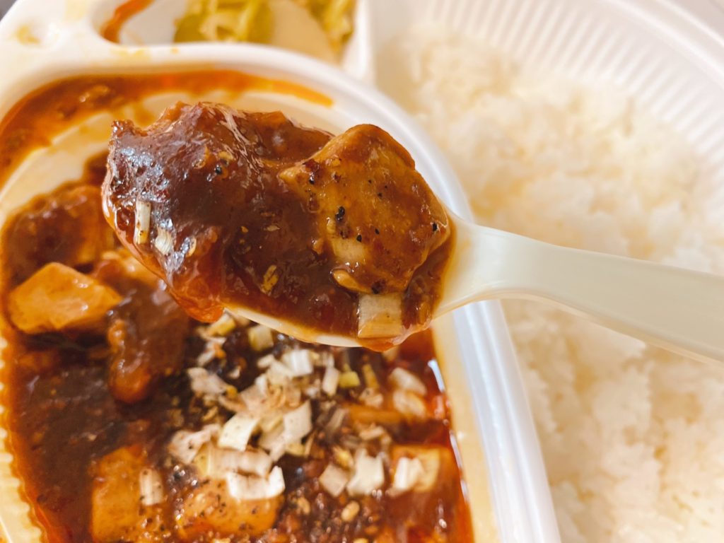 見た目がとてもシンプルなお弁当、麻婆丼になっていますが、麻婆豆腐は本物でした。