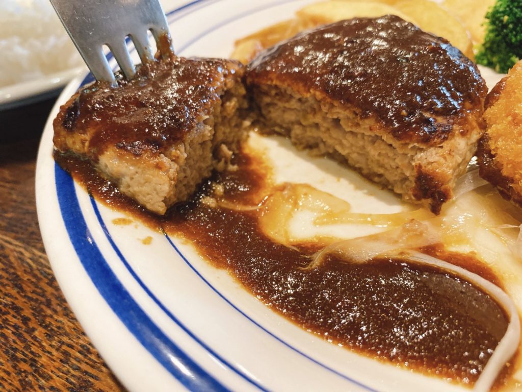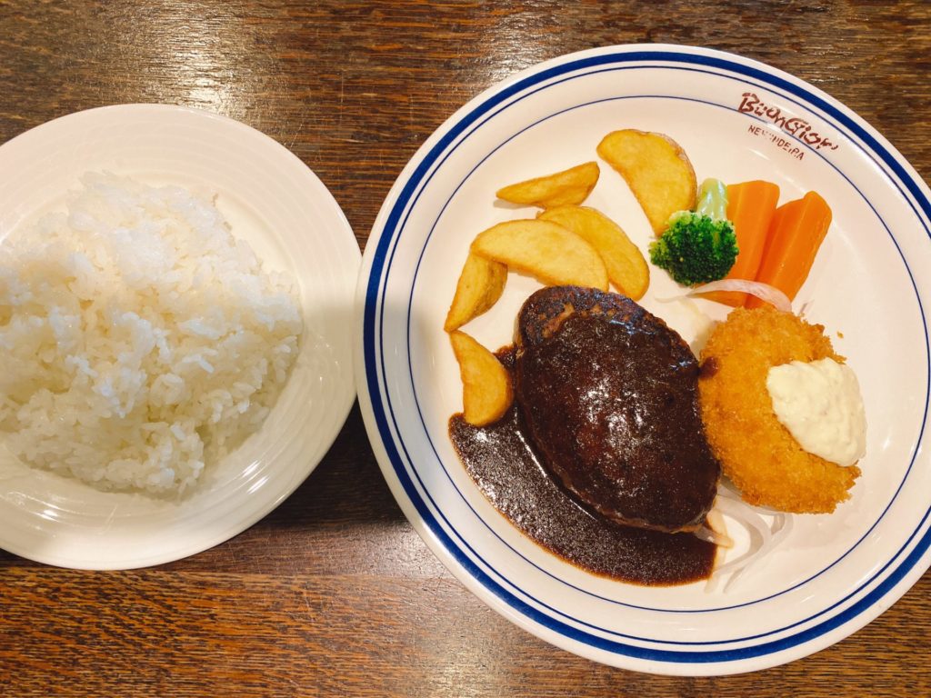 ボンジョルの週替わりランチは厚みのあるハンバーグと、衣がカリカリで中トロトロのカニクリームコロッケが美味