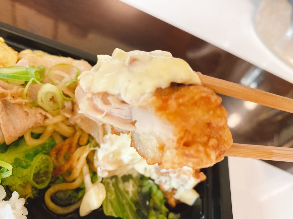 箸で割いたので、切り口がキレイじゃありませんが、結構な厚みがあり、肉自体にも旨味のある下味が付けられているような感じです。