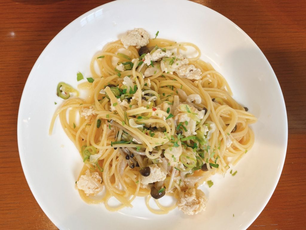 A:鶏ミンチとキノコ・青ネギのペペロンチーノ