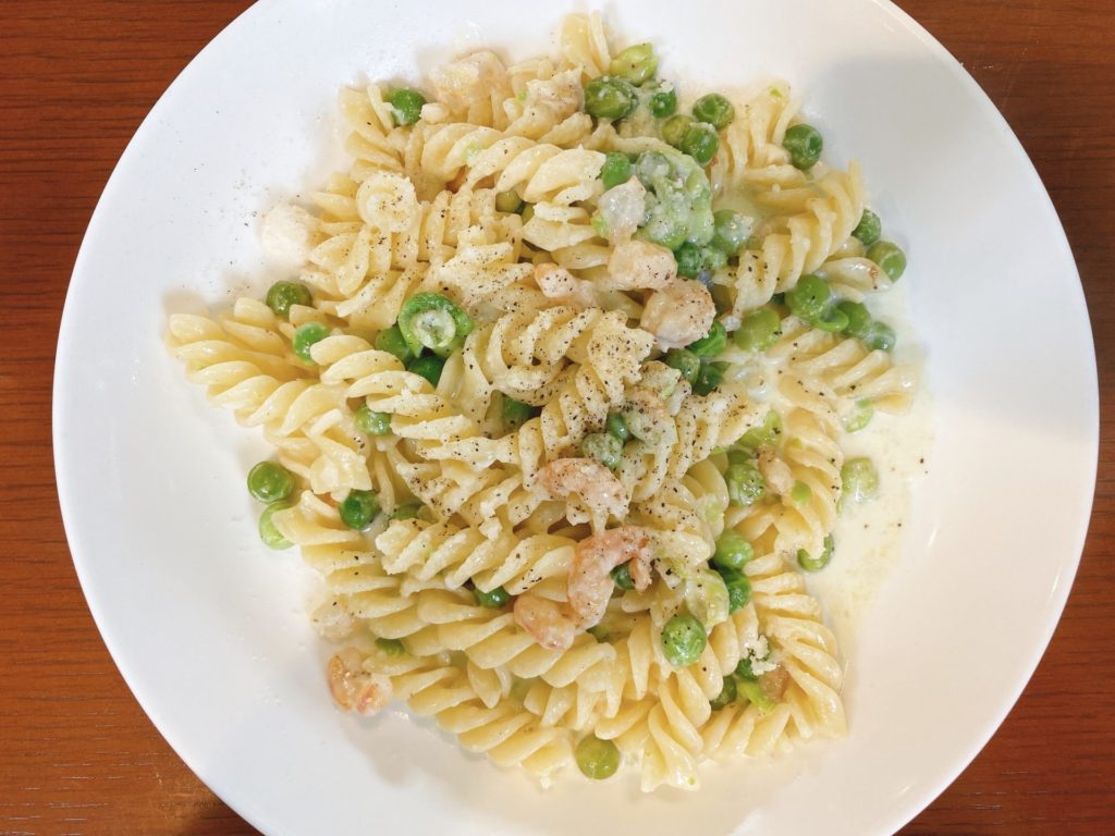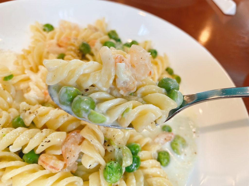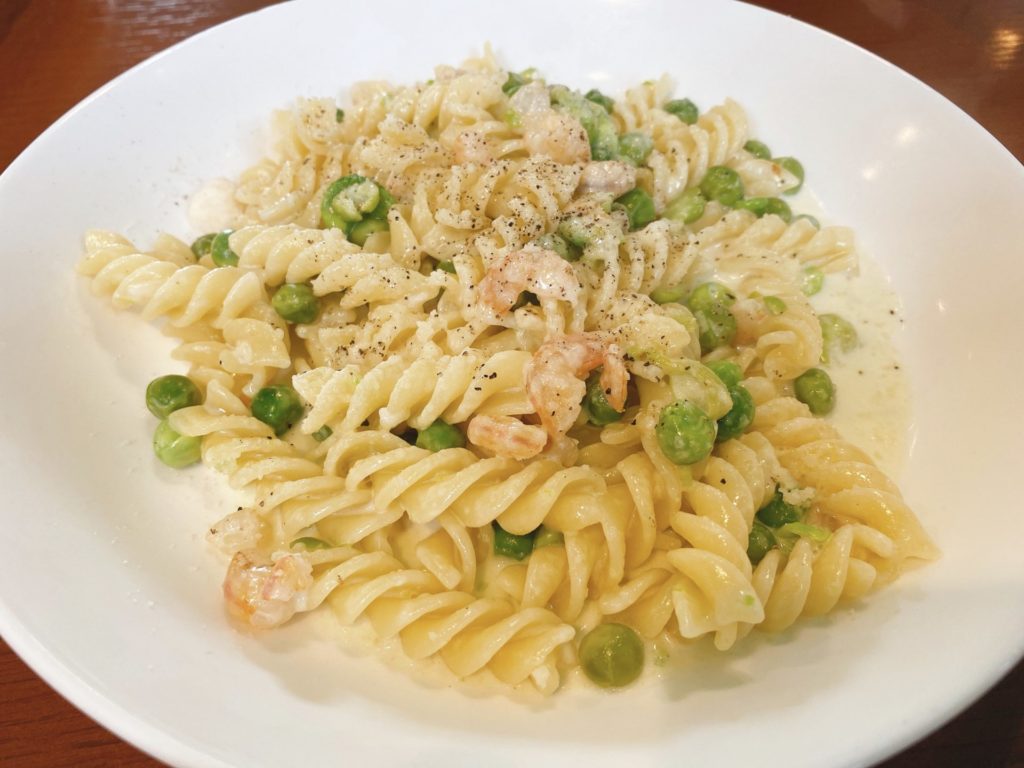 そして私がメインで食べた、Cの小エビとグリンピースのクリームソース ショートパスタです。