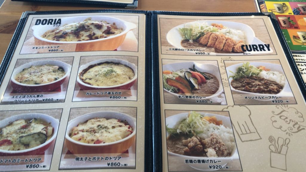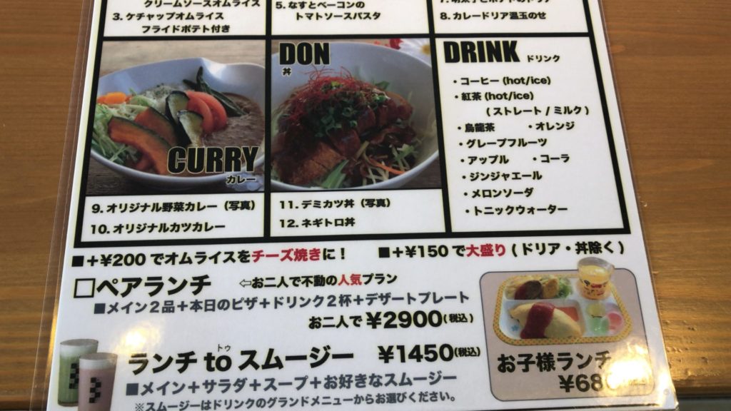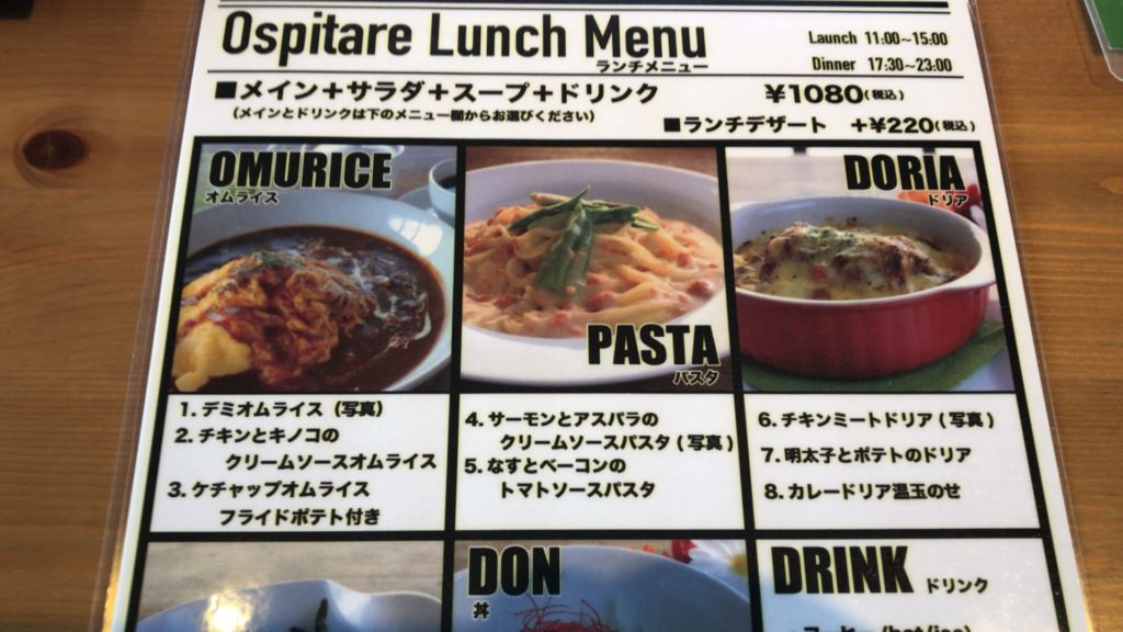 ランチは、オムライス 3種類、パスタ 2種類、ドリア 3種類、カレー 2種類、丼 2種類の中から選ぶようになっています。
