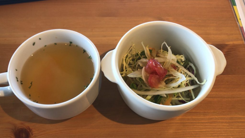 オーダー後、5分くらいでスープとサラダが出て来ました。