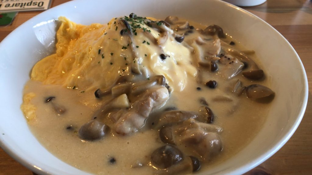 でも、このお店は確か、オムライスが美味しいとどこかで見たような気がしたので、デミオムライスにしようかとも思いながら、チキンとキノコのクリームソースオムライスにしました。