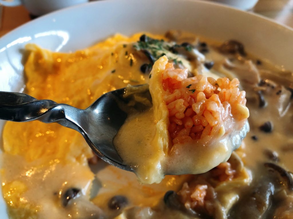 オムライス=ケチャップ、みたいな一般的なオムライスしか知らない世代としては、ある意味、えっ!これがオムライス??的な、軽くジャブをくらったような衝撃を覚えましたが、美味しそうであることには間違いありません。