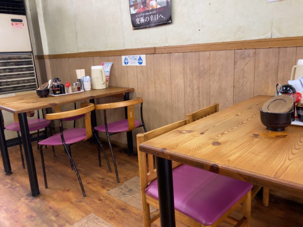 対面カウンターのようになった4人用のテーブルと、6人用のテーブルが2つあり、私は6人用の端に着座。