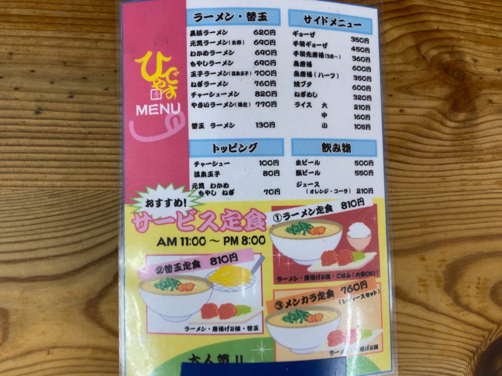 ①のラーメン定食はラーメン・唐揚げ2個・ごはん(大盛OK)で、②替玉定食はラーメン・唐揚げ2個・替玉、そして③のメンカラ定食はラーメンと唐揚げ2個のレディースセットとなっています。