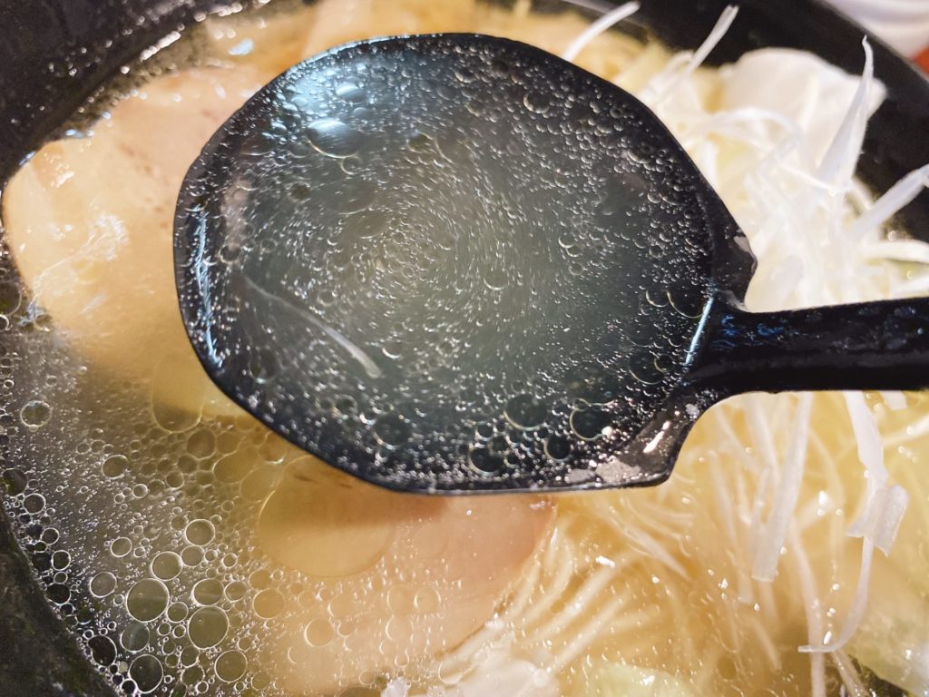 嵐家の塩らーめんのスープは、ひと口飲んで鶏ガラ・塩ダレ・焦がしニンニクの旨味が広がり、やめられない!