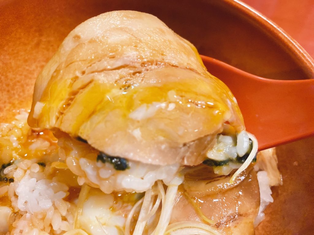 半熟卵を割ると、黄身がトロ~~~って流れてチャーシューを包み込みむよう。