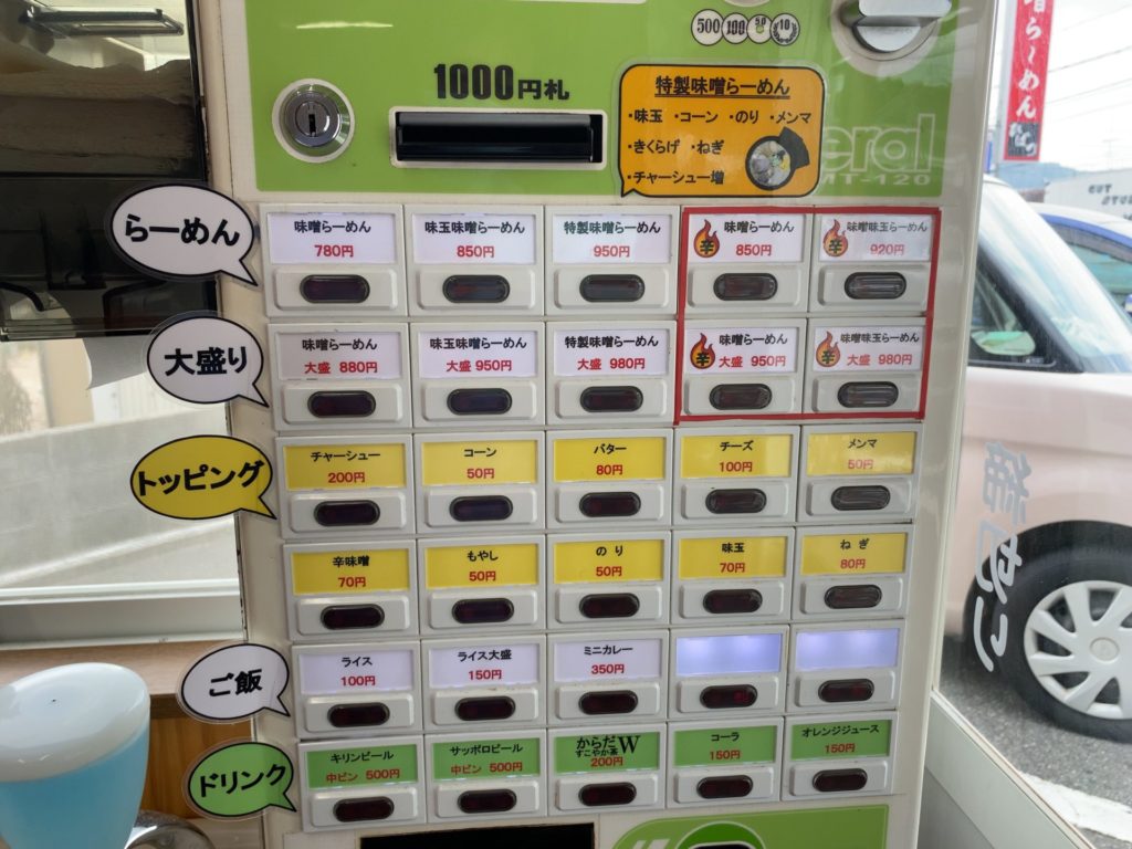 入り口の看板メニューにもあった、辛味噌ラーメンが超気になりますが、初訪問ゆえ今日は味玉やチャーシュー増しの特製味噌ラーメンに決めて食券を購入しました。