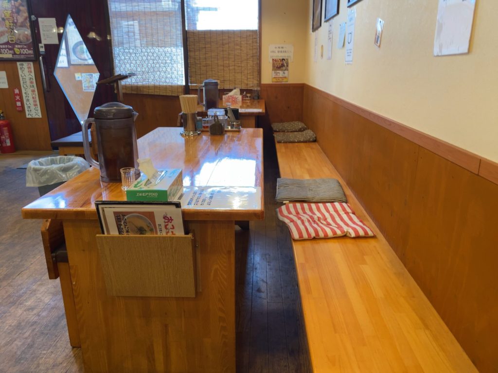 何を食べようか迷いつつ入店して、4人用テーブルに着座です。