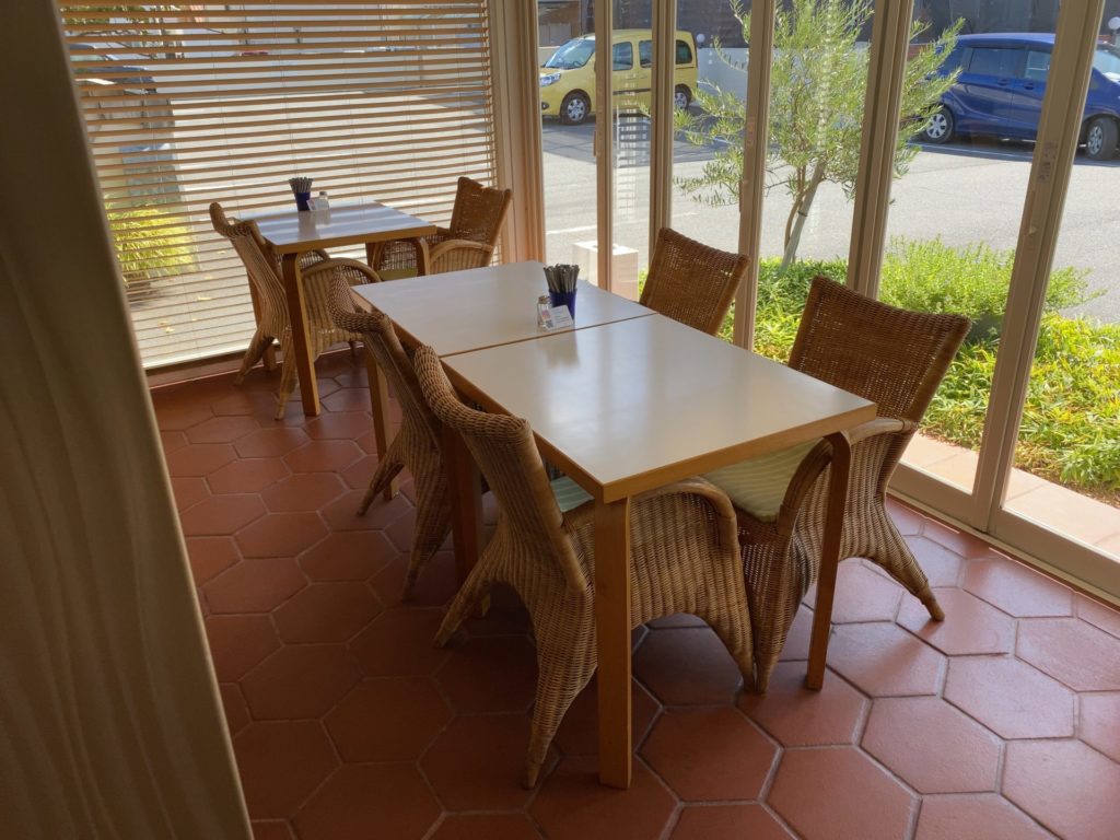 こちらのテラス席は、4人用の丸テーブルが2つ、あと2人用テーブルが6つで、4つが4人用にアレンジされてますね。