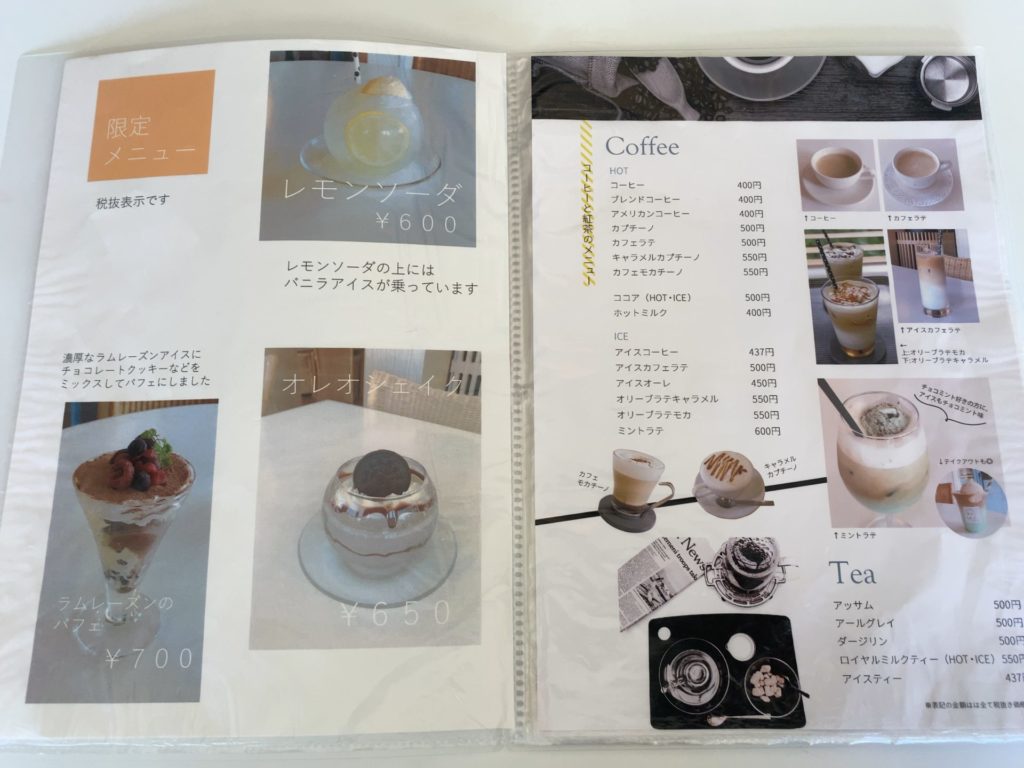 こちらはドリンクメニューですが、限定のレモンソーダやラムレーズンのパフェ、オレオシェイクなんて、普段は甘いものを食べない私でも興味アリ。